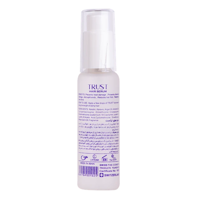 موادموثره در سرم موی تراست، روغن آرگان، کراتین، روغن بادام و جوانه گندم است