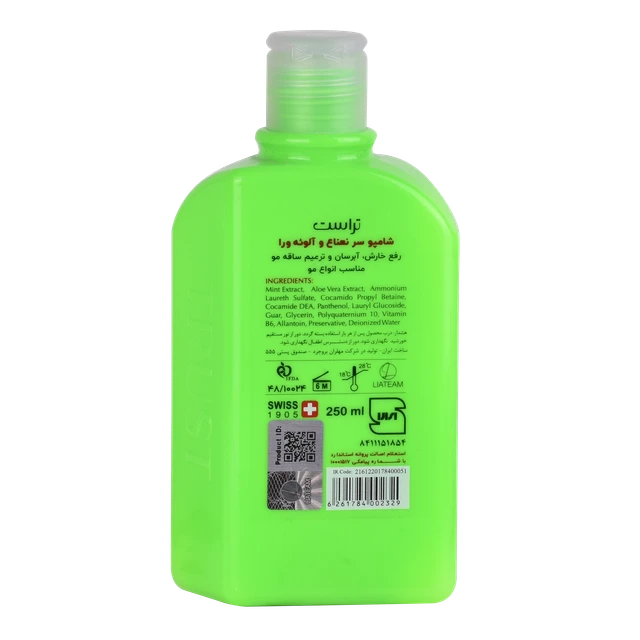 | مواد موثره | عصاره نعناع، عصاره آلوئهورا، آمونیوم لورت سولفات، کوکامیدوپروپیل بتائین، کوکامید DEA، پانتنول، لوریل گلوکوزید، گوار، گلیسیرین، پلی کواترنیوم-10، ویتامین B6، آلانتوئین، نگهدارنده، آب دیونیزه |