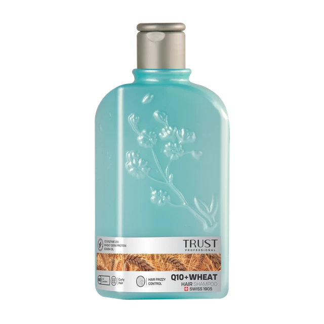 شامپو سر جوانه گندم و Q10 تراست، با داشتن پروتئین جوانه گندم، روغن جوجوبا و کوآنزیم کیوتن، از وز شدن تارهای موی شما جلوگیری کرده و حالت فر موهای شما را حفظ میکند. همچنین با استفاده از این محصول، تارهای مو و پوست سرتان آبرسانی شده و از خشکی آنها جلوگیری میشود.