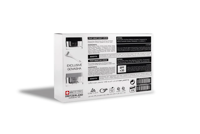 جوان کننده پوست با داشتن ترکیبات فعال پپتیدی، آمیتوز 3GA، Duraquench IQ، عصاره سلول بنیادی دانه انگور، میتوکینیل، ویوندین و کوآنزیم کیوتن افزایش استحکام پوست و رفع چین و چروکهای پوستی با داشتن ترکیبات فعال پپتیدی تتراپپتاید-۴، تتراپپتاید-۶۱، سرامید NP، هیالورونیکاسید و توکوفرول مهار کننده پرتوهای UV و روشنکننده پوست با داشتن ترکیبات فعال آمیتوز 3GA، نیاسینآمید، سیمبرایت، سیمدتوکس و میتوکینیل حاوی ترکیبات فیلتر کننده پرتوهای UV و مراقبت از پوست در برابر این پرتوها با داشتن SPF 30+ تسکیندهنده التهابات پوستی با داشتن ترکیبات فعال ویوندین، نیاسینآمید، روغن آرگان و بیزابولول مواد مؤثره کرم روز تراست اسمارت: