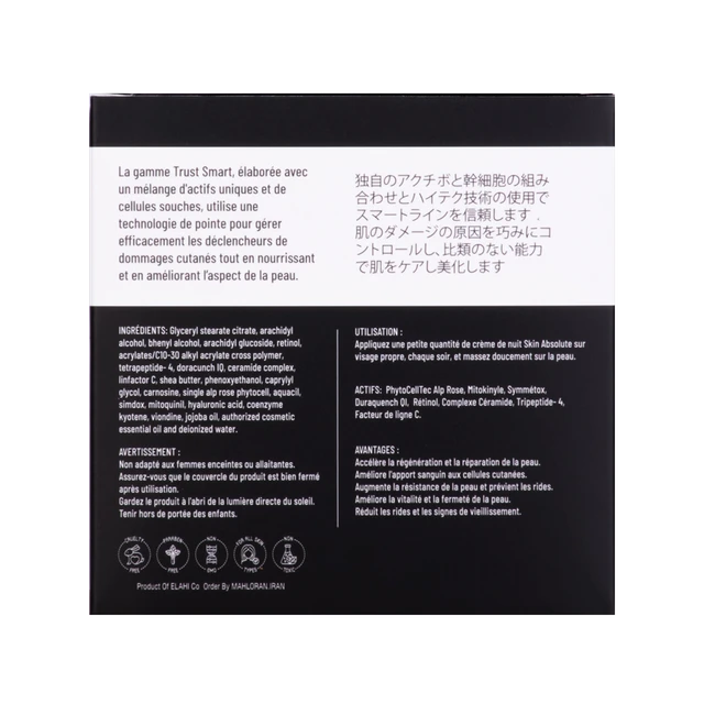 | نحوه مصرف | مقدار مناسبی از کرم شب تراست اسمارت را روی پوست تمیز و شسته شده قرار داده و به آرامی ماساژ دهید و صبح بعد از بیدار شدن صورت خود را بشوئید |