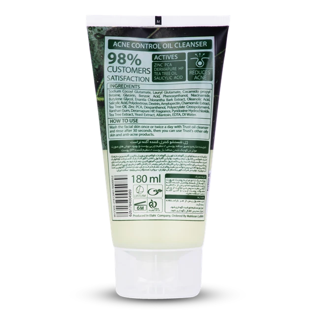 حجم 180 میلیلیتر نحوه مصرف روزانه یک تا دو مرتبه پوست صورت را توسط ژل شستشو کنترل کننده آکنه تراست شستشو داده و پس از 30 ثانیه آبکشی نماید سپس می توانید از سایر محصولات پوست تراست استفاده نمایید فرم محصول ژل جنسیت مصرف کننده عمومی نوع پوست پوستهای چرب و مختلط کاربرد شوینده ملایم و عمیق منافذ پوستی، تنظیم چربی پوست و بهبود جوشهای صورت، موثر در کوچک شدن منافذ باز پوست، تنظیم کننده pH پوست مواد موثره زینک پی سی ای، درماپیور اچ پی، روغن درخت چای، سالیسیلیک اسید شرایط نگهداری دور از دسترس اطفال و نور مستقیم خورشید نوع بسته بندی تیوبی مدت انقضا 3 سال تاییدیه Swiss Fine Cosmetic شماره ی تاییدیه 1905 شماره پروانه بهداشت 48/ظ/1416 بازه زمانی