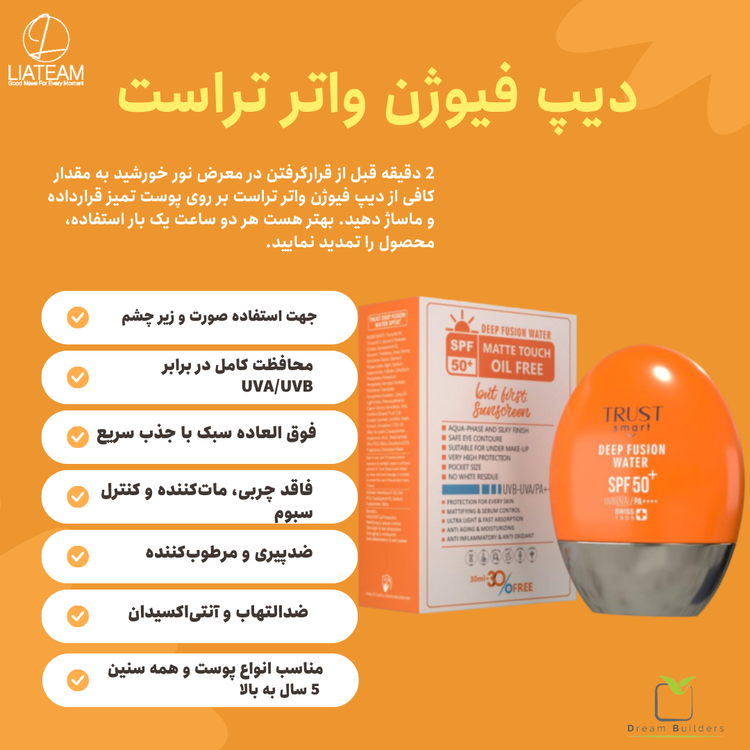 | نحوه مصرف | کافیست 2 دقیقه قبل از قرارگرفتن در معرض نور خورشید به مقدار کافی از دیپ فیوژن واتر تراست بر روی پوست تمیز قرارداده و ماساژ دهید. بهتر هست هر دو ساعت یک بار استفاده از محصول را تمدید نمایید |