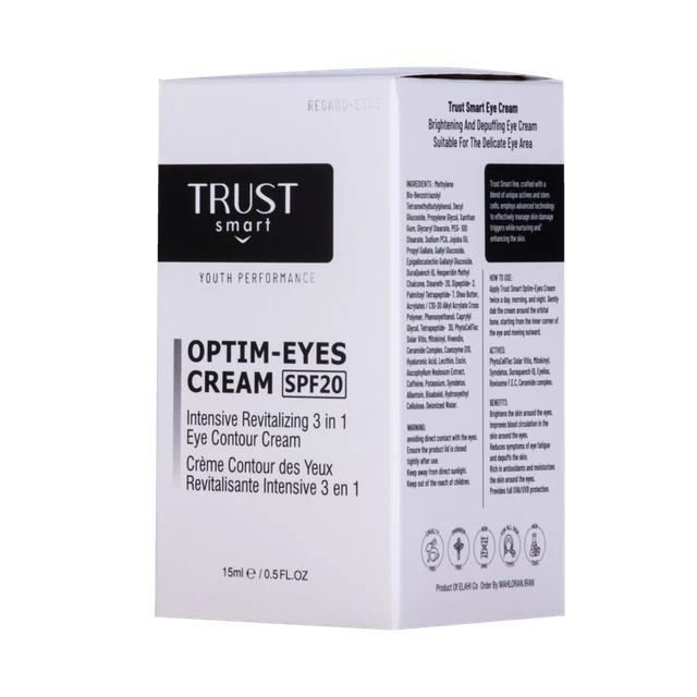 | نحوه مصرف | کرم ضدتیرگی و پف دور چشم تراست اسمارت را روزانه دو بار صبح و شب از سمت داخل به خارج، بر روی پوست اطراف چشم با حرکات ملایم و ضربه ای پخش کنید |