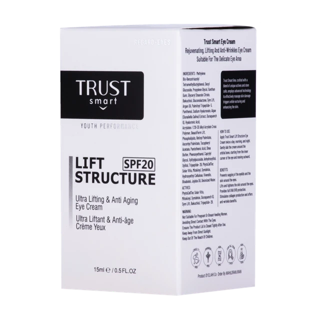 | نحوه مصرف | کرم لیفت و ضدچروک دور چشم تراست اسمارت را روزانه دو بار صبح و شب از سمت داخل به خارج، بر روی پوست اطراف چشم با حرکات ملایم و ضربه ای پخش کنید |
